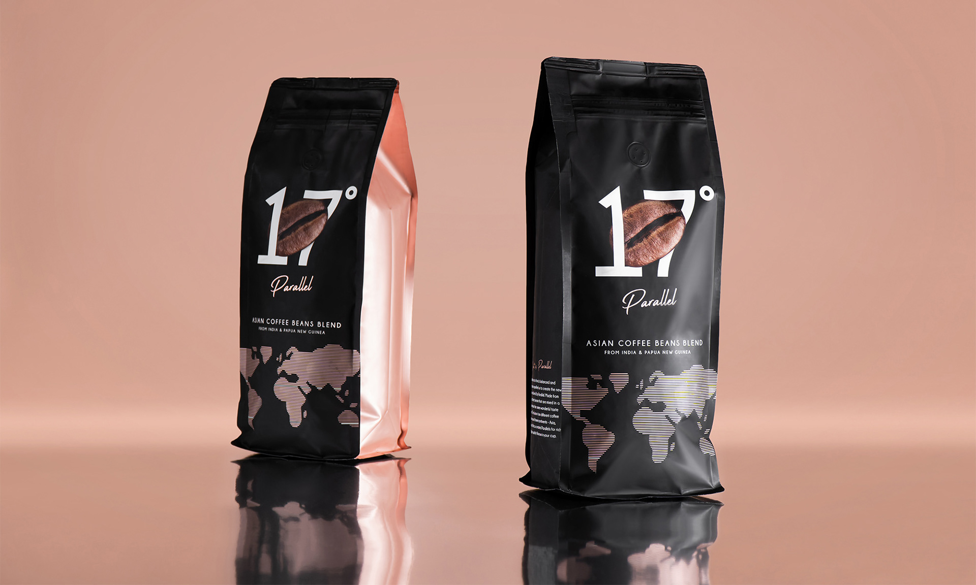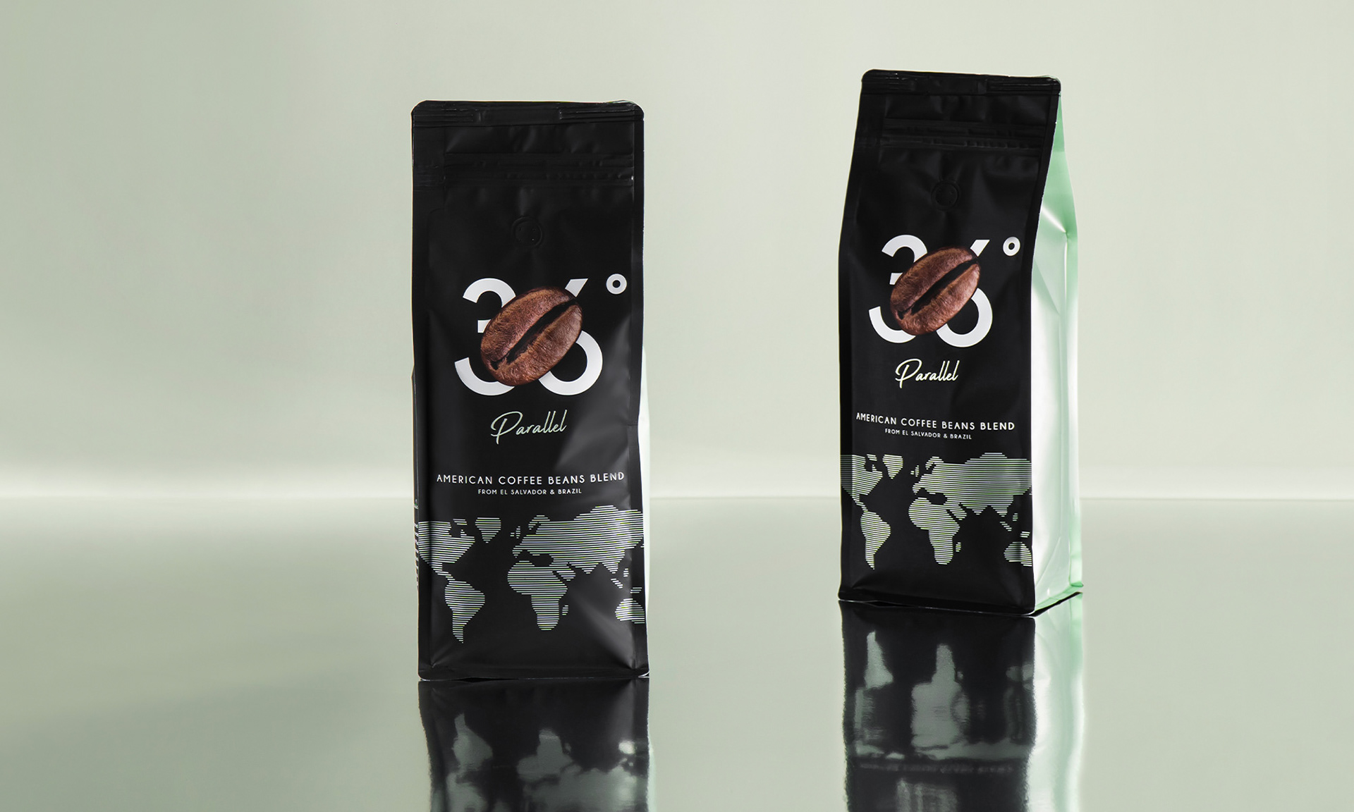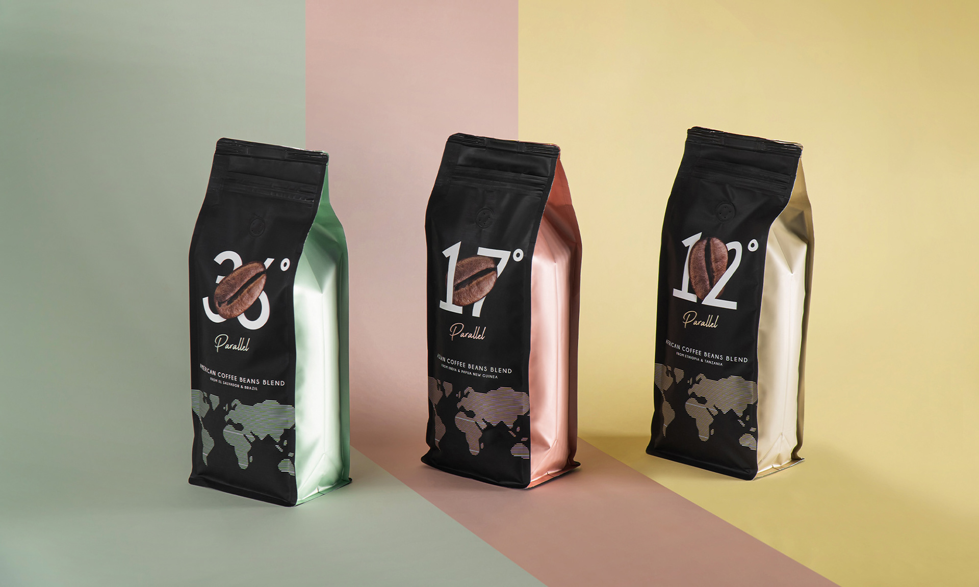 For each coffee to have its unique detail, three different colours were used to create the packaging design. The shiny side is the main thing that makes it different from most coffee packages. These glossy colours give the packaging a sense of luxury, in addition, it confirms that ”Parallel” coffee beans are of the premium blend. Important to mention that ziplock eases the usage and helps to preserve the aroma of coffee for a longer period of time.